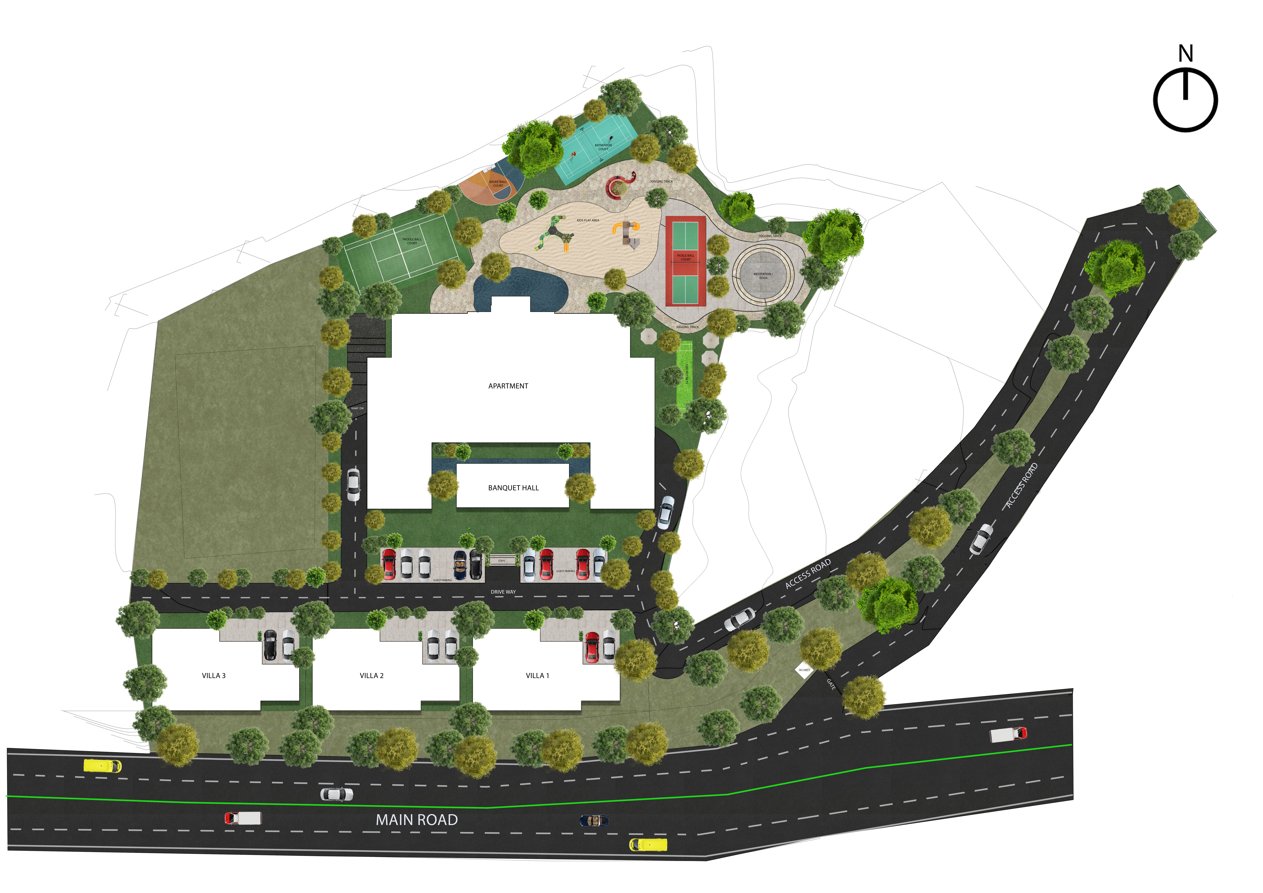 - Recreation & Sports Zones – Indoor gaming areas and outdoor courts including badminton, basketball, and cricket practice net